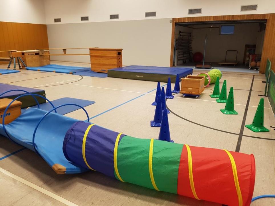 Das Herzstück der Turnstunde ist die Bewegungslandschaft, in der die Kinder an Groß- und Kleingeräten spielerisch die unterschiedlichen Fertigkeiten trainieren, z.B. das Gleichgewicht, das die gesamte motorische und kognitiv seelische Entwicklung des Kindes fördert.